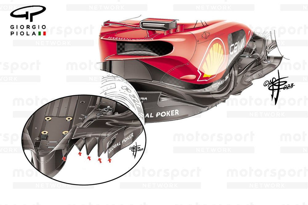 Encontrar la perfecta integración es quizá lo más difícil, puesto que además de los túneles Venturi que actúan a lo largo de la carrocería, se puede segmentar el suelo en tres zonas, con la delantera en la que residen las entradas y desviadores de flujo que crean el efecto que tenían los bargeboards en 2021. La intención de los ingenieros es alimentar el efecto outwash que se incrementa a medida que crece la velocidad [cuanto más aire va hacia el exterior de la rueda trasera, mayor es la posibilidad de que las turbulencias nocivas generadas por la delantera en movimiento puedan colarse bajo la zona central, provocando pérdidas].