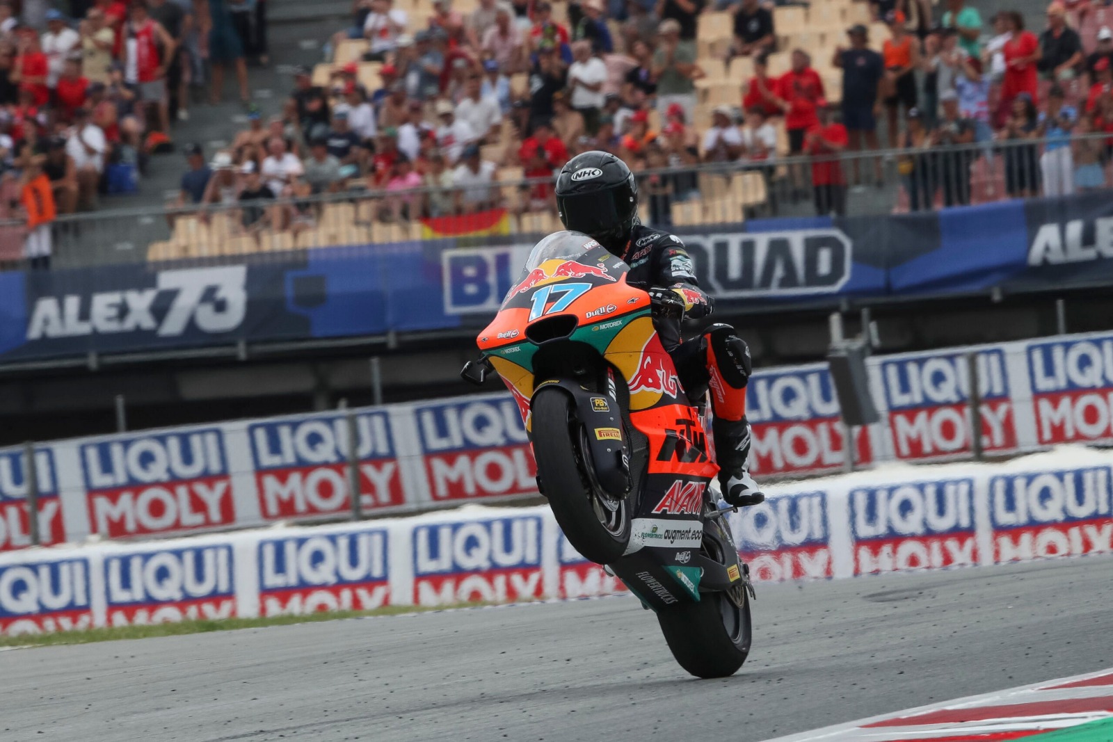 Respuesta: "Yo creo que todavía no he podido ni asimilarlo. Al final, es una cosa por la que uno sabe que ha luchado muchísimo, y ha sufrido muchísimo para llegar a eso, pero al final me lo tengo que tomar como si fuera... Evidentemente, tengo que disfrutarlo muchísimo, pero no darle más vueltas. Tú haces un resultado así, y a las 24 horas o sigues entrenando o preparándote para las siguientes carreras, o lo que has hecho este fin de semana no vale para nada, para el futuro, por así decirlo. Pero evidentemente se disfruta muchísimo, y es como cumplir parte de un sueño: llegar al Mundial, hacer podio con un equipo como KTM... Eso es prácticamente un sueño".