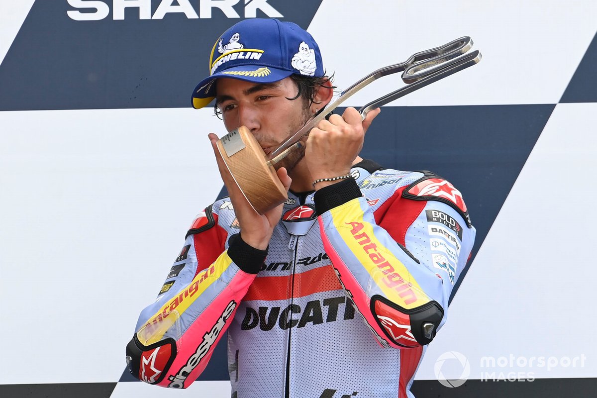 El italiano lo hizo en lucha directa con los dos pilotos oficiales de la marca, Jack Miller, que solo pudo verle de lejos, y Pecco Bagnaia, que al intentar ganarle el pulso, acabó en el suelo.