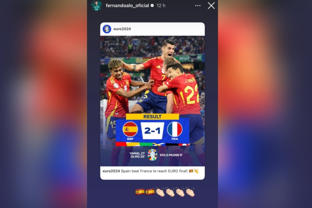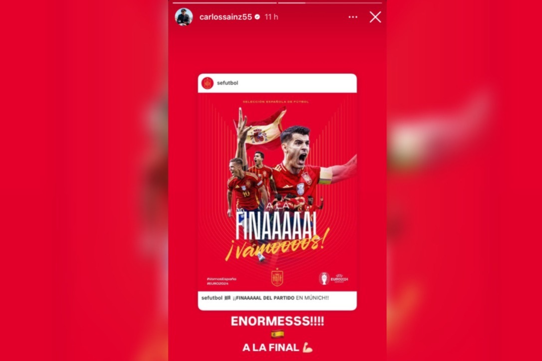 En Fórmula 1, los dos pilotos españoles se hicieron eco del triunfo de los de Luis de la Fuente con goles de Lamine Yamal y Dani Olmo. Fernando Alonso compartó en sus stories (publicaciones que duran 24 horas) el post de la propia Eurocopa, acompañado de aplausos y de la bandera de nuestro país. Carlos Sainz, por su parte, compartió la publicación de la cuenta de la Selección con un mensaje que decía "Enormess!!! A la final".